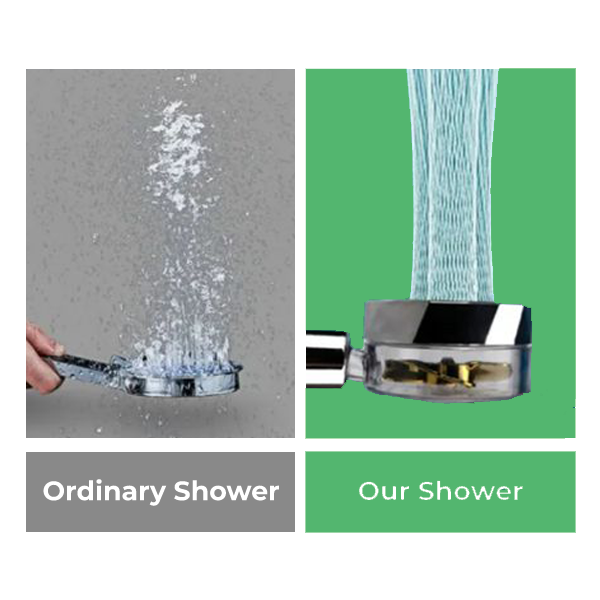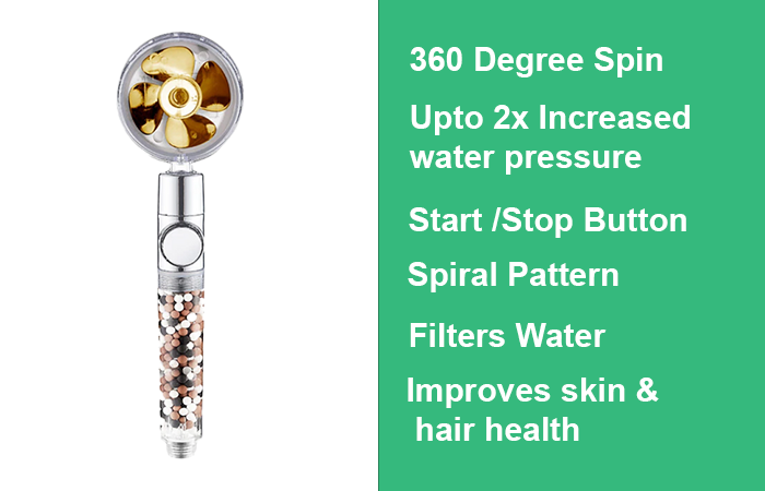 Turbofan sprchová hlava využívá turbofan design, který vytváří krásný vzor tekoucí vody a zlatý zbarvený ventilátor vypadá také krásně. Sprchová hlavička šetří vodu a má laserově řezané mikromany, které zvyšují rychlost vody a poskytují až dvojnásobek tlaku vody pro zvýšený zážitek ze sprchování.